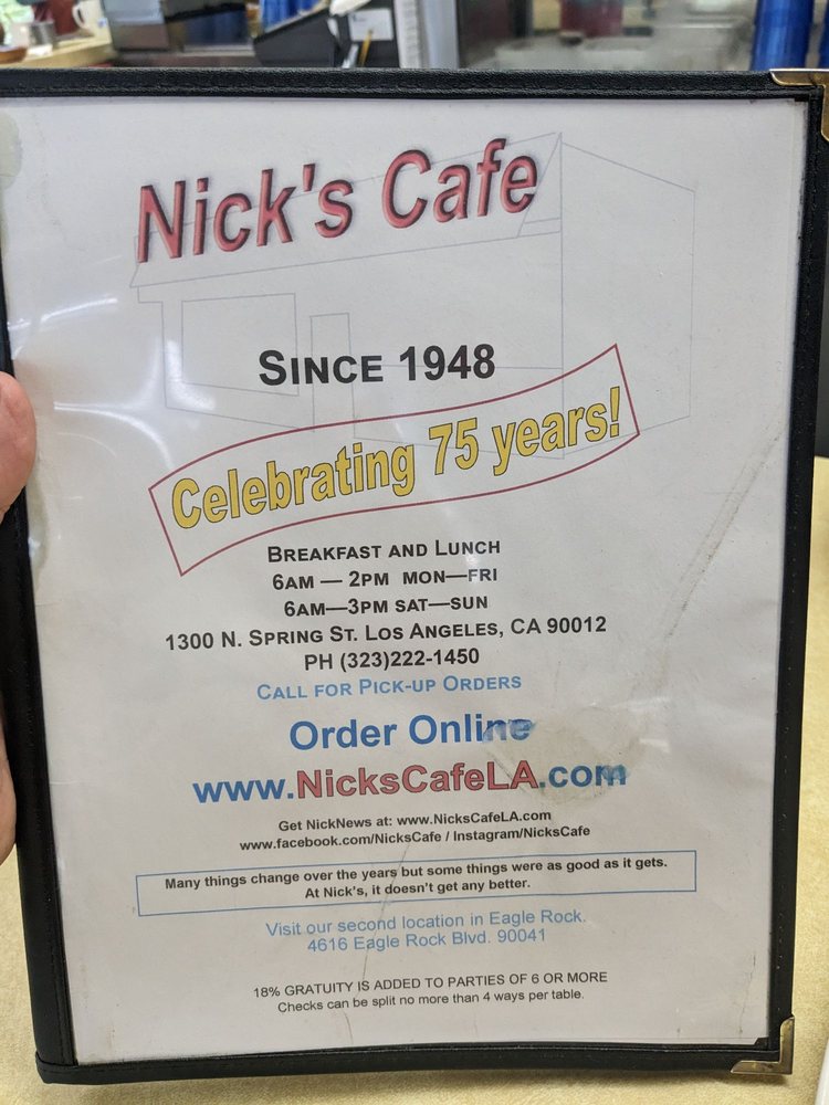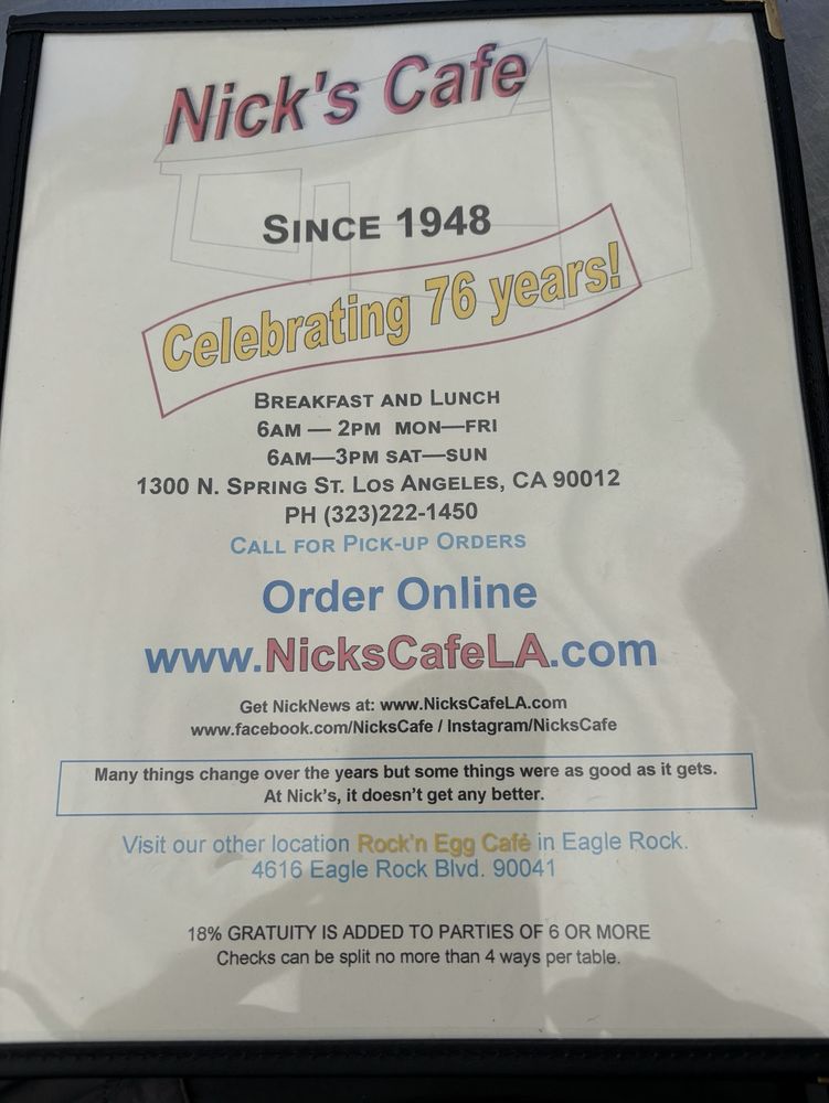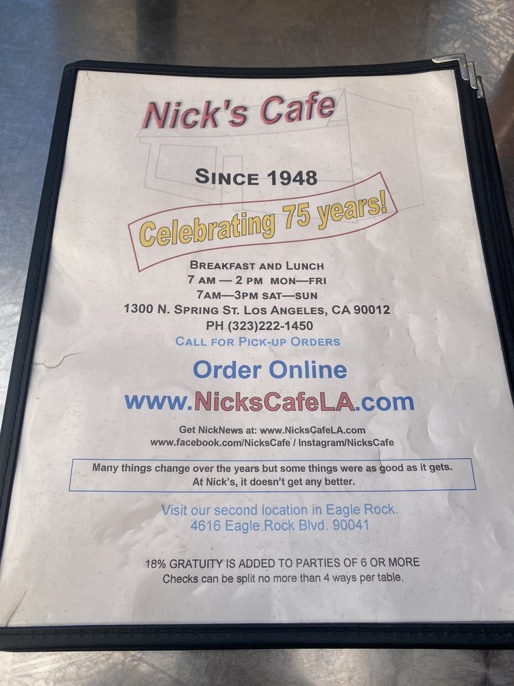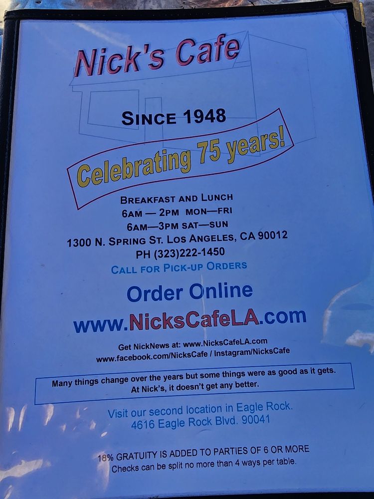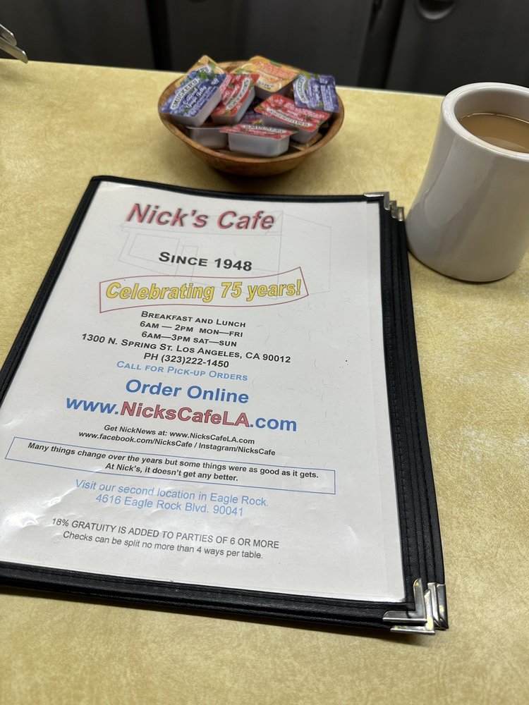 Nick's Cafe, located in Los Angeles, offers a variety of diner-style dishes, sandwiches, and breakfast options. With a cozy atmosphere and friendly service, this cafe is a favorite among locals and tourists alike. The menu caters to a wide range of dietary preferences, with vegan and vegetarian options available. Customers praise the breakfast burritos, chilaquiles, and Baja breakfast for their generous portions and delicious flavors. The cafe also offers outdoor seating, perfect for enjoying your meal on a sunny day. Don't forget to try their unique bar setup and famous salsa! Nick's Cafe is a must-visit spot for a hearty and satisfying meal in LA.